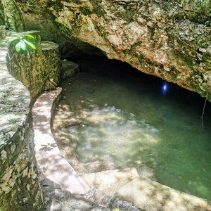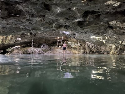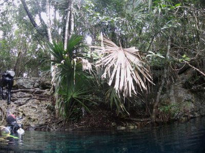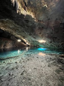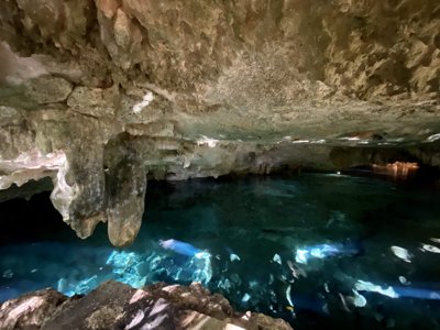 Underground cave cenotes. Stunning stalactites and crystal-clear water for divers.