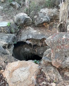 Partially covered with cave formations. Mix of natural light and dramatic shadows.