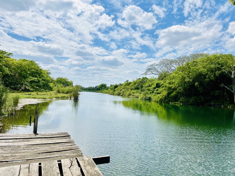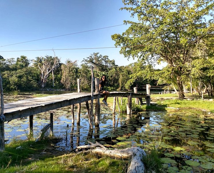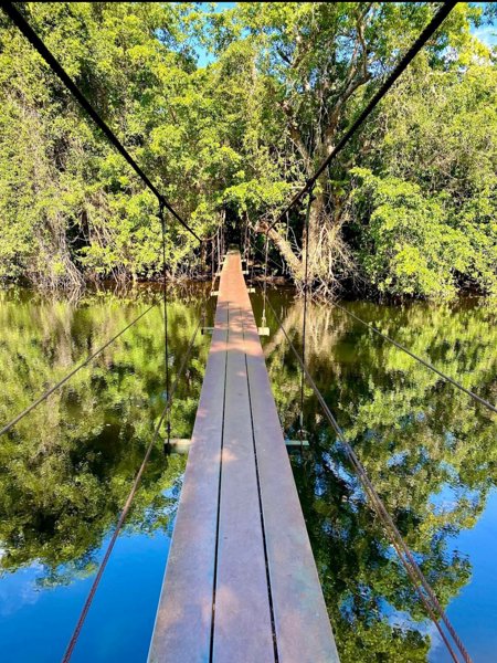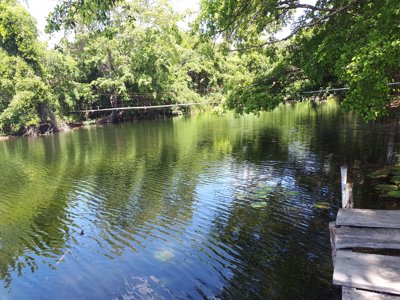 "Eye of the Flower"; a tropical eco-reserve in Hampolol, Campeche featuring two cenotes connected by a crystal-clear river with a long suspension bridge over the jungle canopy. Visitors can kayak from one cenote to the other or walk across the bridge for panoramic views.