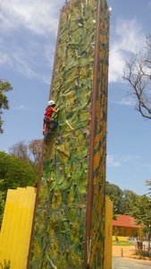 Recreational park with a climbing wall, swimming pool, running track, camping & fitness equipment.