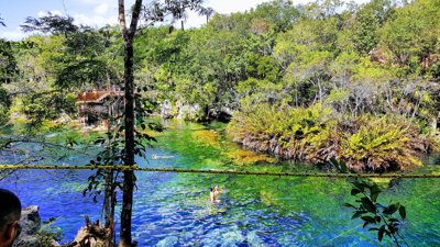 Clear-water sinkhole lagoon surrounded by forest, with scuba diving through submerged caves.