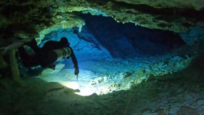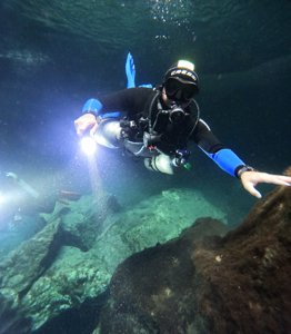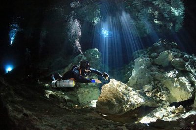 Limestone formations, tunnels & chambers, plus light effects, in a cenote popular for cave diving.