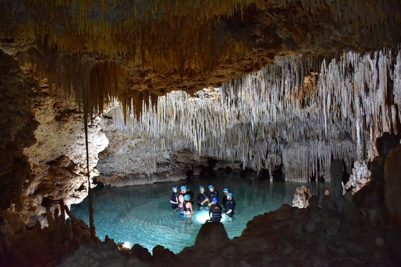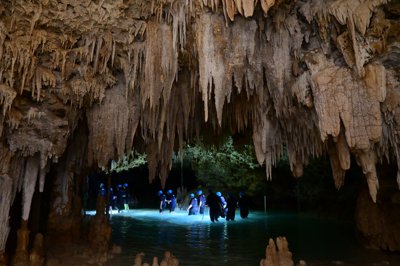 Hiking & swimming excursions along a turquoise underground river with stalactites & stalagmites.