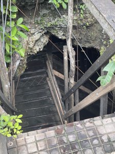 A deep cave cenote with a hole in the roof and stunning blue water with light beams.