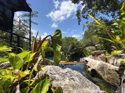 A social cenote park with a bar, hammocks, and a lively afternoon atmosphere.