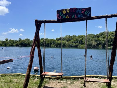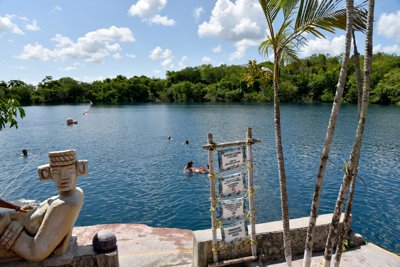 A massive, pitch-black open pit next to the Bacalar lagoon; over 90m deep.