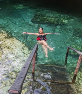"Butterfly Cenote"; a beautiful open-air pool near Tulum with crystal clear water and lush underwater gardens. A relaxed, family-friendly cenote perfect for swimming and snorkeling, with a café and toilets on-site.