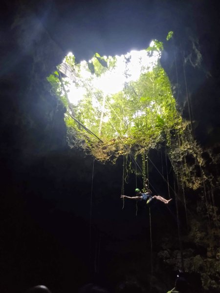 "Earth"; part of the exclusive Xenotes tour by Xcaret near Puerto Morelos, Cenote Lu'um is a closed cavern where visitors rappel down into a turquoise pool. The dramatic vertical descent through stalactite-lined walls is a highlight of the tour.