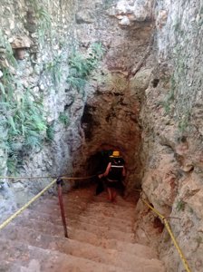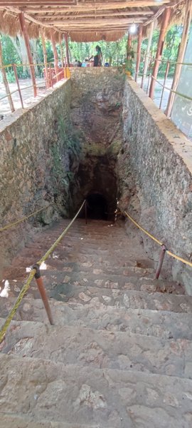 Shallow, subterranean swimming hole accessible by tunnel with stalactites & stalagmites.