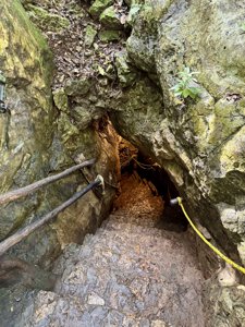 Picturesque cavern featuring a striking blue natural swimming hole & large stalactites.