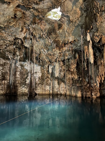 📝 Notes: Combined ticket with neighboring Cenote X'Kekén. Tree roots extend down from ceiling opening into the water.