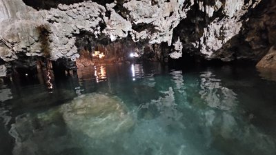 Located next to Cenote X'Kekén in the village of Dzitnup near Valladolid, Cenote Samulá is another breathtaking underground cenote. Its cave ceiling features a larger opening than X'Kekén, and a dramatic tree trunk with roots extends down from the surface through the hole, creating a surreal natural sculpture above the azure water.