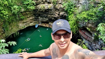 Features four high viewing towers and a 360° platform over a deep open-air sinkhole.