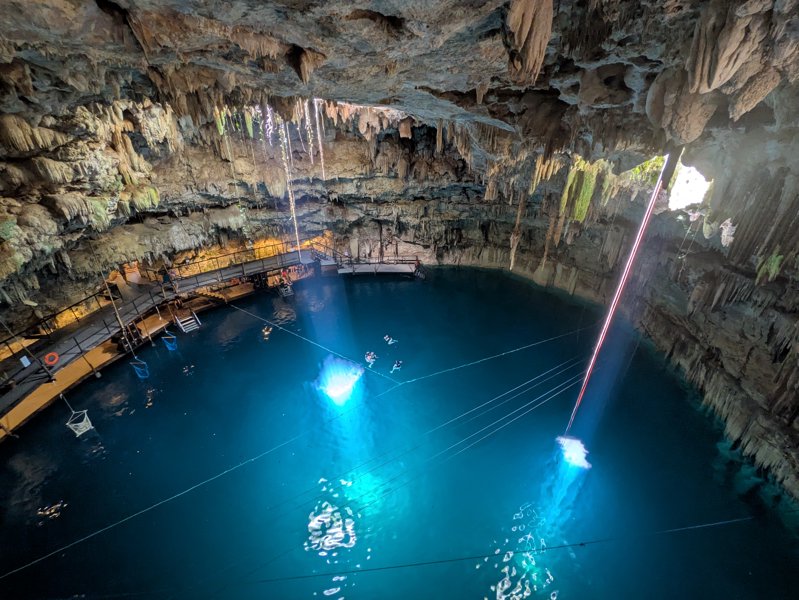 A high-adrenaline cavern part of Hacienda Chukum, featuring diving platforms and a zip-line.