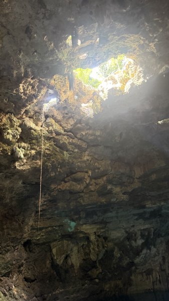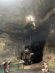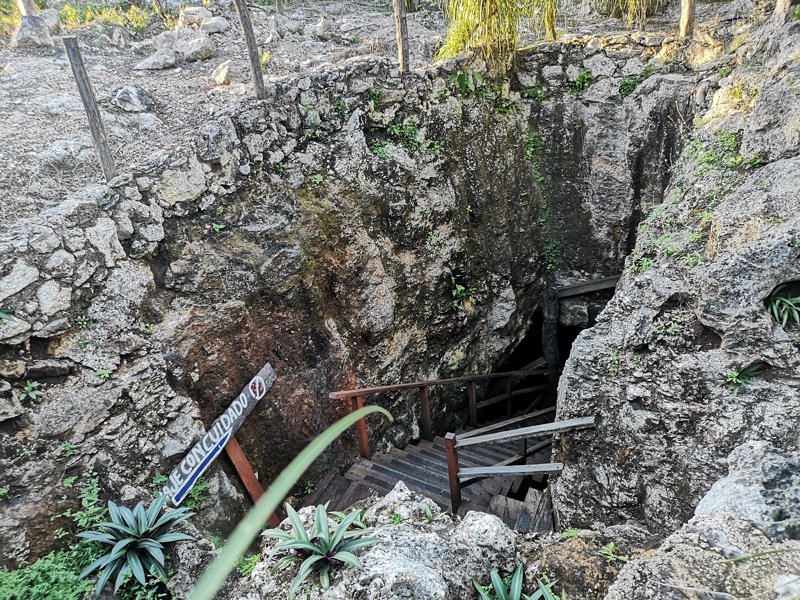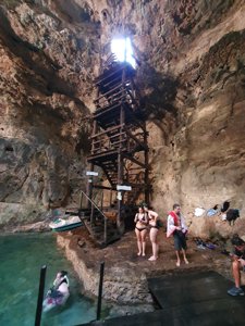 A rustic cave cenote reached by a 24-meter wooden ladder; very deep and peaceful.
