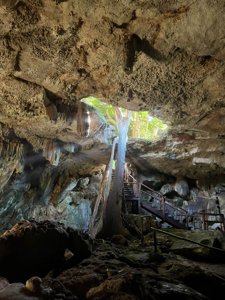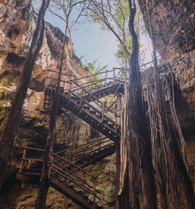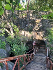 Cave cenote with impressive rock formations and easy stair access.