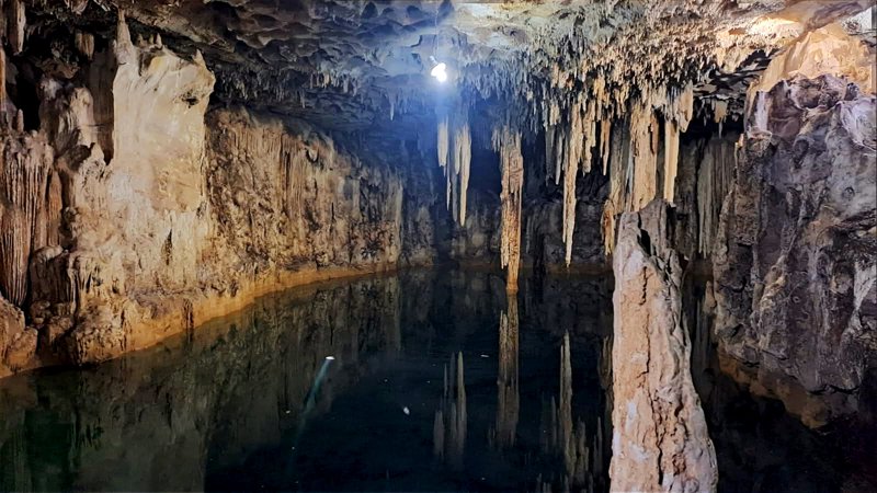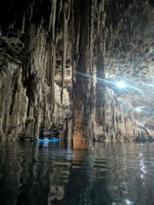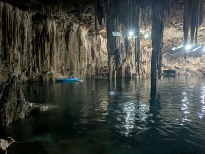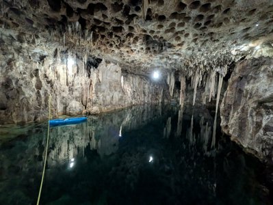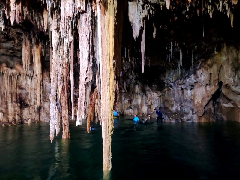 Cave cenote with blue tones and impressive stalagmite formations.