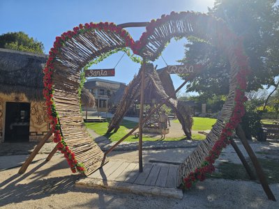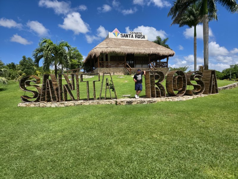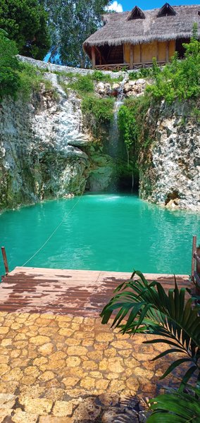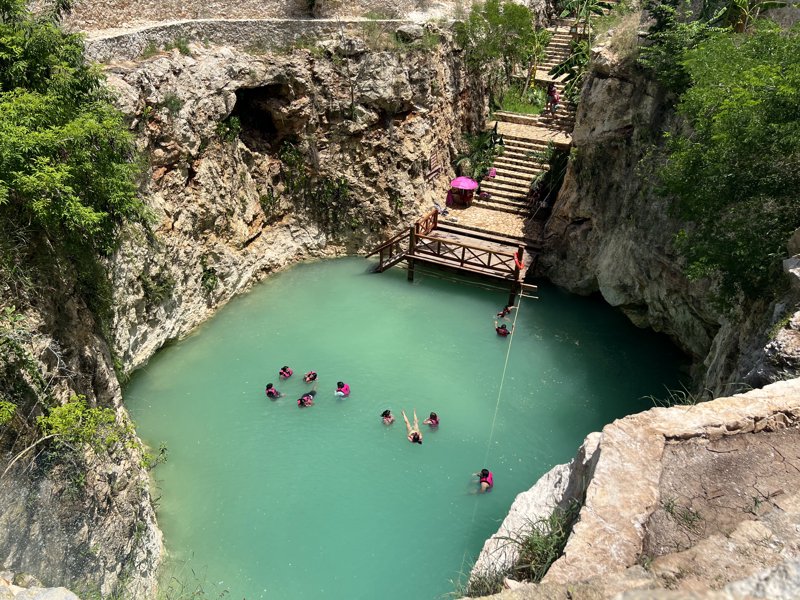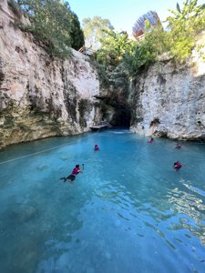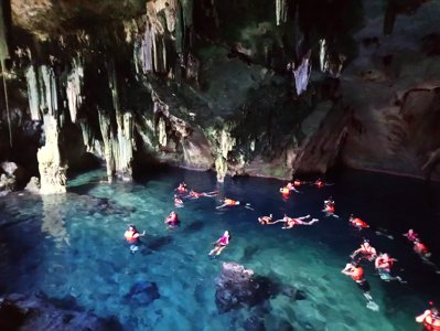 A tourist park cenote with colorful lighting and an underground restaurant.