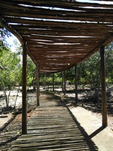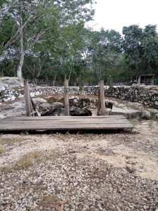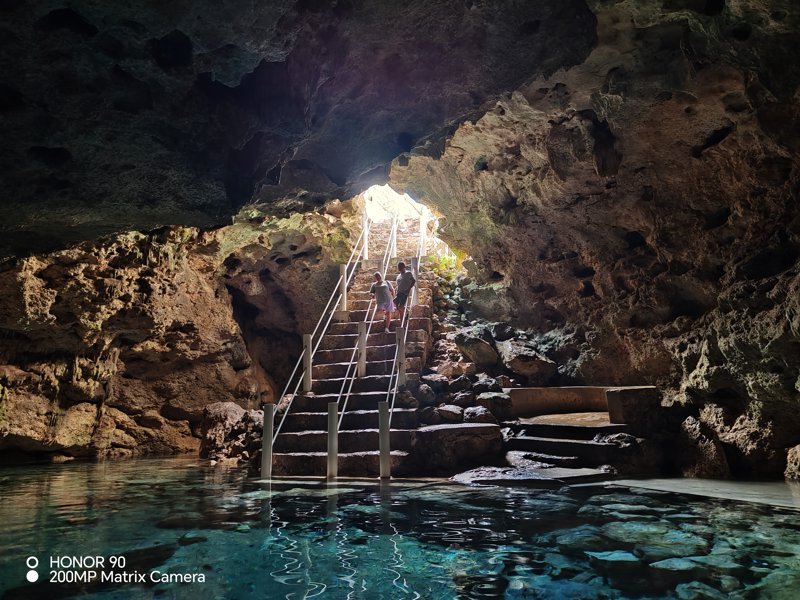 Shallow cavern with clear water; features fossilized shells in the limestone walls.