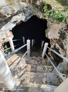 Shallow cavern with clear water; features fossilized shells in the limestone walls.
