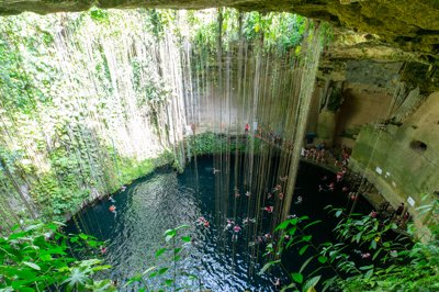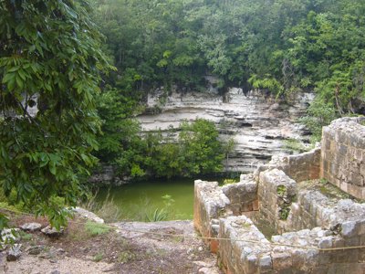 Cenote once used as a Mayan water reservoir, with several small temples & ruins nearby.