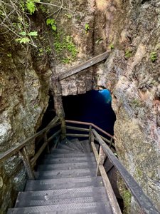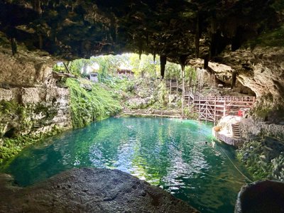 Picturesque cavern featuring a striking blue natural swimming hole & large stalactites.