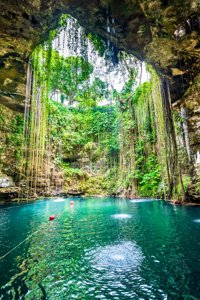 Scenic cenote framed by verdant rock walls & threadlike vines, a popular spot to swim & snorkel.