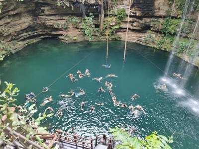 A massive open cenote (65m wide) featuring double ziplines; first stop on the Ruta de los Cenotes.
