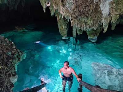 A legendary dive site near Tulum, Cenote Angelita is a cylindrical sinkhole that descends to 60 meters. At around 29–33 meters, a permanent hydrogen sulfide layer creates a surreal "river in the jungle" effect — dead trees draped in sulphur mist float beneath the layer, creating one of the most photographed underwater scenes in the world.