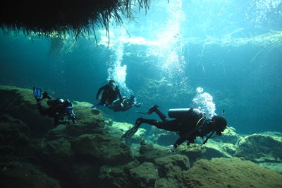 A submerged freshwater vent in the Caribbean Sea near Puerto Morelos. Identified via satellite as an offshore blue hole accessible by boat for expert divers.