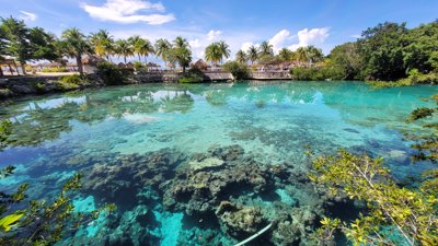 A coastal cenote and lagoon inside the Chankanaab National Park on Cozumel island. A unique mix of fresh and salt water creates a rich marine environment. Part of a larger park complex with full tourist amenities.