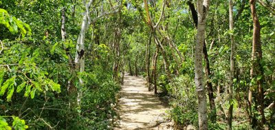 A small, sheltered cenote located within a private beach club near Akumal, Cenote Chemuyil sits just steps from the Caribbean Sea. The turquoise water is calm and warm, popular with families. Surrounded by mangroves, the cenote also serves as a natural habitat for local birds and iguanas.