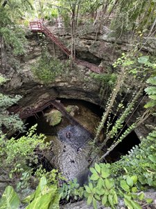 A massive vertical shaft cenote hidden deep in the jungle west of Tulum. Its sheer walls drop 40 meters straight down to the water, making it one of the most dramatic cenotes in the region. Difficult to access but spectacular for those who make the journey.
