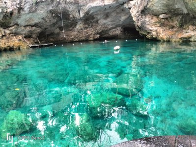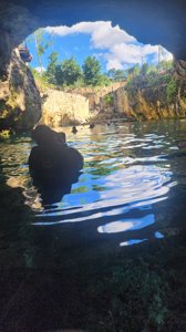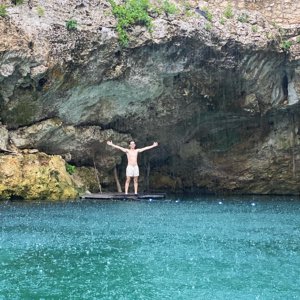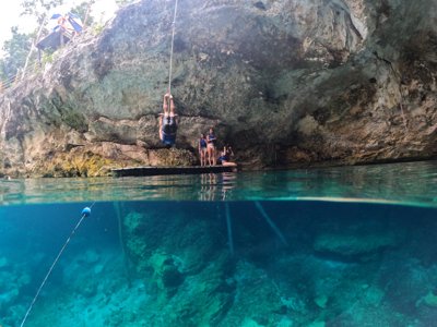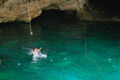 An open, jungle-surrounded cenote with high platforms for jumping.