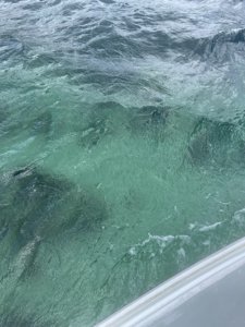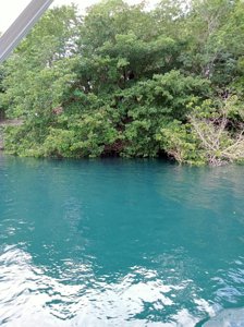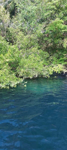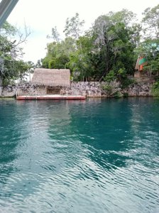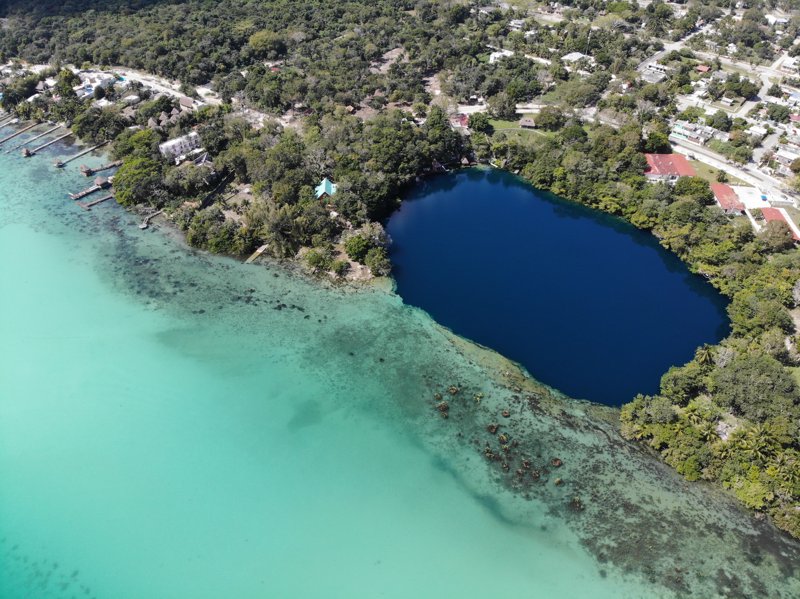 A deep "black hole" inside Bacalar lagoon famous for the sudden, dramatic depth drop from the shallow lagoon floor. Its dark, deep water contrasts strikingly with the turquoise lagoon surrounding it.