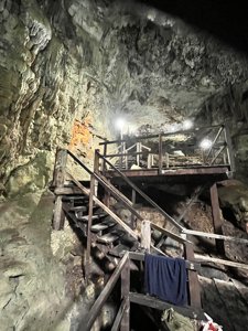 A large cavern with emerald waters where light beams enter through a hole in the ceiling.