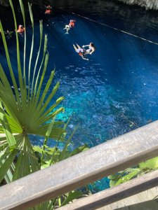 A massive open cenote with a 5m jump platform and deep blue, clear water.