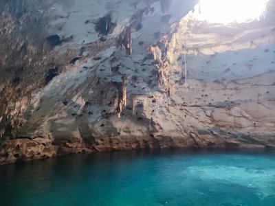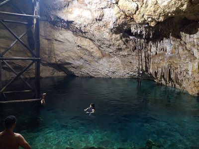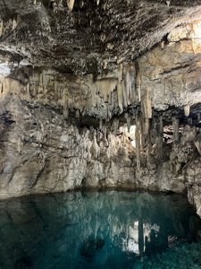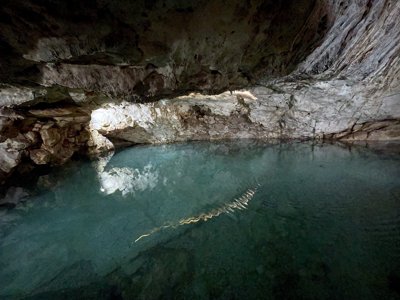 Shallow, subterranean swimming hole accessible by tunnel with stalactites & stalagmites.