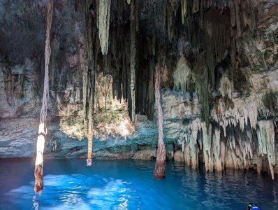 A deep cave cenote known for a 2.5-hour guided "underworld" tour and massive stalactites.