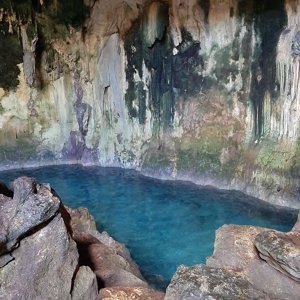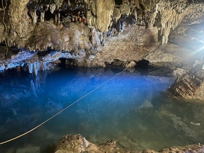 Picturesque cavern featuring a striking blue natural swimming hole & large stalactites.