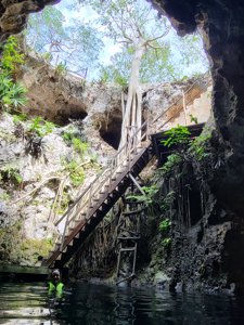 A rustic cave cenote reached by a 24-meter wooden ladder; very deep and peaceful.