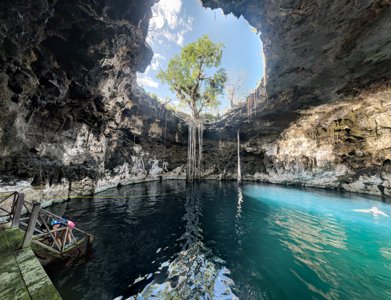 Natural sinkhole near Ek Balam ruins with cool, turquoise water for swimming & a zipline overhead.